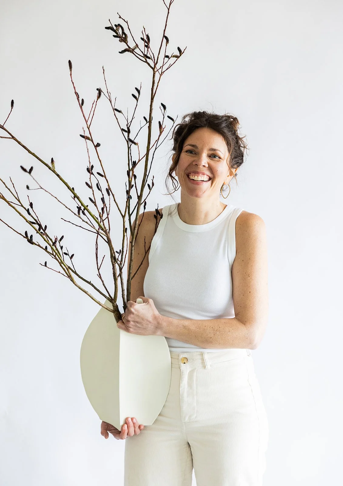My functional wares are finished with either matte white or clear gloss glaze. The woven vessels are a range of stained porcelain or stoneware with waxed linen stitching. The rings of clay are so tightly tied with the linen cord that there is no movement between the clay rings.